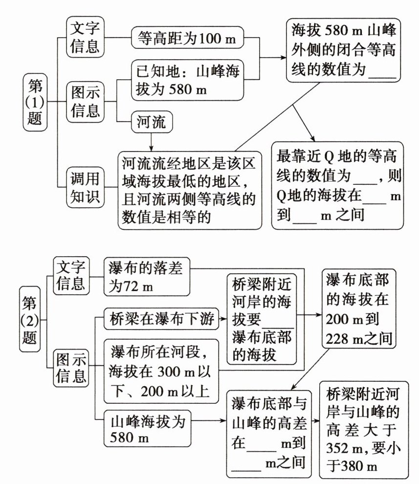 典例1(经典高考题)下图示意某小区域地形。图中等高距为100 m,瀑布的落差为72 m。据此完成(1)~(2)题。