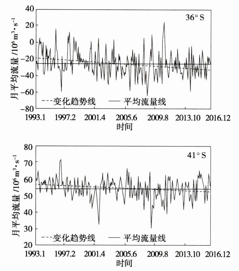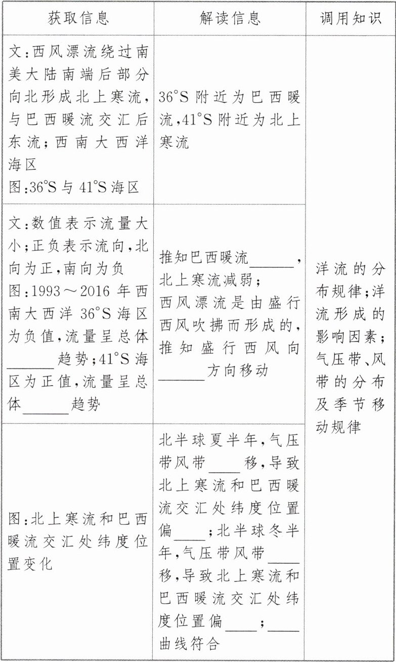 典例(2023·江苏卷)西风漂流绕过南美大陆南端后部分向北形成北上寒流,与巴西暖流交汇后东流。下图为 1993~2016 年西南大西洋海区 36°S 和 41°S 附近两个截面逐月洋流流量及变化趋势图(数值表示流量大小;正负表示流向,北向为正,南向为负)。据此完成(1)~(3)题。