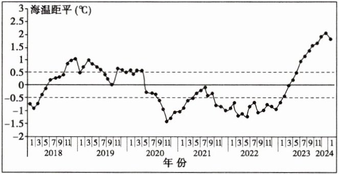 (2024·北京昌平区二模)下图为2018年1月~2024年1月赤道太平洋中东部海域海温距平变化情况统计图。当该海域海温距平高于0.5℃且持续3个月以上,出现厄尔尼诺现象;海温距平低于-0.5℃且持续5个月以上,则出现拉尼娜现象。读图,完成1~2题。