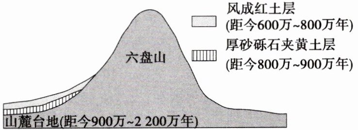 (2025·广东惠州第二次调研)六盘山位于青藏高原东北缘与鄂尔多斯地块的交界处,海拔2 000~2 900米。研究显示,六盘山山麓风成红土堆积对六盘山的形成具有良好的指示意义,且红土层保存较完整。下图为六盘山及其山麓剖面示意图。据此完成1~3题。