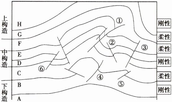 (2024·陕西渭南一模)鄂西—渝东区是地质构造复杂区,下图为鄂西—渝东区地质剖面示意图,图中A—H表示岩层,其中“上构造层”为陆相砂泥岩地层,其岩层形态与地面构造类似,断裂破坏作用较弱。“中构造层”主要是以海相碳酸盐岩为主的地层,该构造层断裂发育,具凹凸相间的结构特征。“下构造层”总体表现为构造宽缓,断裂相对不发育。据此完成3~5题。