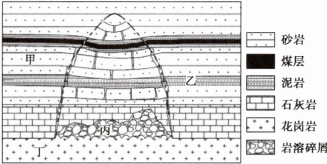 (2024·北京通州区二模)陷落柱一般是指煤层下覆岩层中的可溶性岩石受到外力影响产生空洞,引起上覆岩层塌陷而形成的柱状塌陷体。下图为我国某地陷落柱形成中某一阶段地质剖面示意图。读图,完成1~2题。