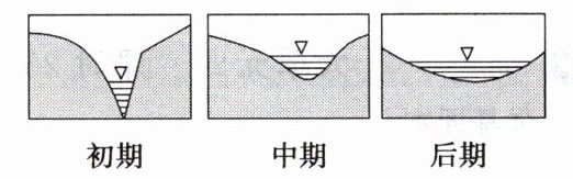 1.初期河谷呈“V”形,中期河谷展宽,后期呈槽形。