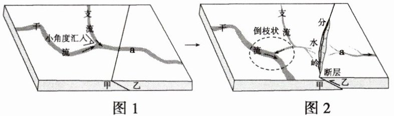 (2024· 广东广州第一次调研)一般情况下,河流支流多呈小角度汇入干流(图 1),但水系重组事件却常形成“倒枝状” 水系形态(图 2)。据此完成 1~2 题。