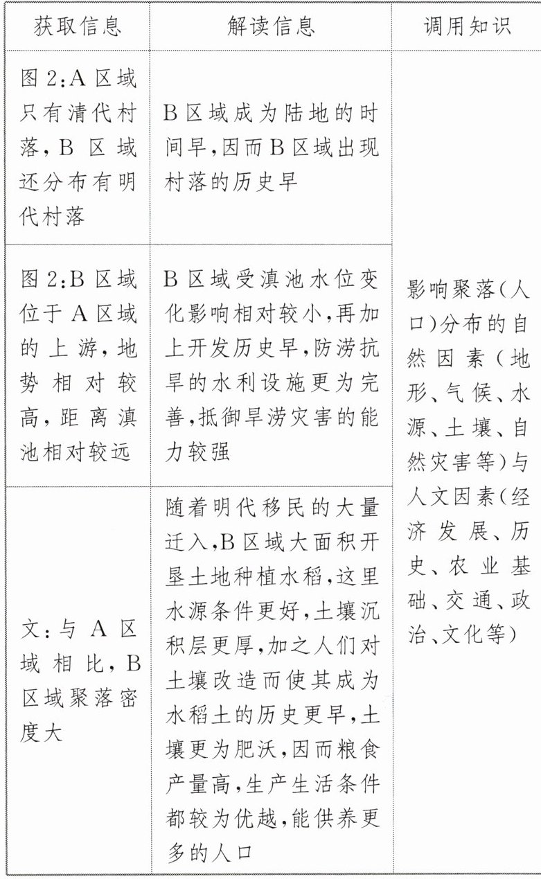 综合思维:从A、B区域的分布位置、明代村落与清代村落分布状况等方面的差异,反推其形成原因。