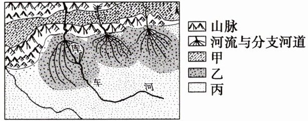1.A 2.C 第1题,由图分析可知,甲沉积物分布于两山地之间,且位于库车河上游地区,最可能为山间戈壁滩砂砾质;乙沉积物主要分布于河流出山口处的冲积扇地区,应为冲积扇砂砾质;丙沉积物主要分布于河流下游地区,应为河流相冲积平原砂质,A正确。第2题,库车河冲积扇位于气候干旱地区,而在潮湿气候下形成的湿地扇发育于长期山区水流,水动力相对平稳,常年有河流搬运和侵蚀作用,沉积物搬运距离远、搬运时间长,沉积物平均粒径较小、磨圆度较高、分选性较好;湿润地区常年有水流搬运泥沙,沉积的平面规模较大;所以与在潮湿气候下形成的湿地扇相比,库车河冲积扇平面规模相对较小,平均粒径较大,磨圆度较低,分选性较差,①④正确,②③错误,C正确。
