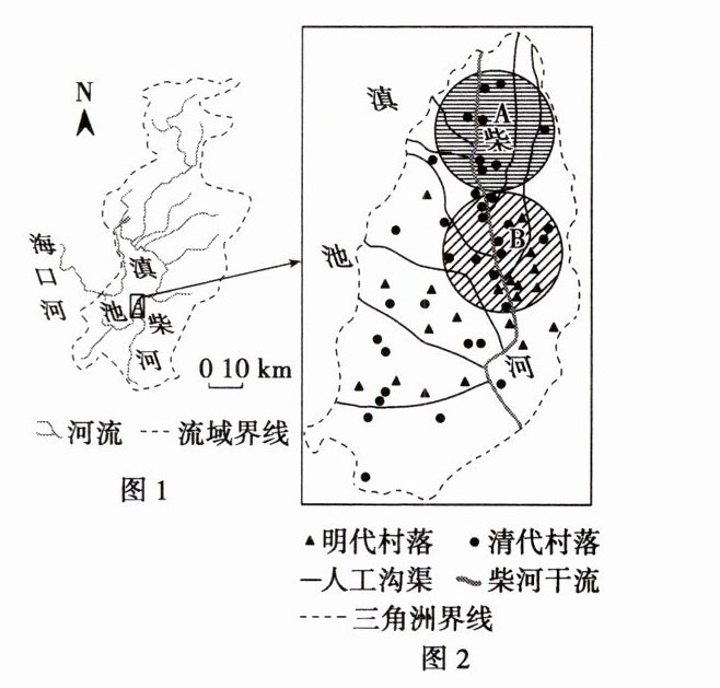 图1为滇池流域示意图。海口河为滇池湖水的唯一出口,元代以来多次疏浚。明代,滇池南岸有大量移民迁入,水稻种植面积逐渐增加。清代,人们在柴河下游相继开挖了十余条沟渠。明清时期,柴河三角洲面积显著扩大。图2示意明清时期柴河三角洲的聚落分布。