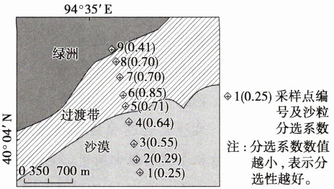 典例 (2024·湖北卷,节选)某科研小组利用多套测风系统,观测记录了敦煌绿洲边缘某年沙漠风和绿洲风的风速、风向与频次,并对表层沙粒采样分析。 结果发现,当地冬季白天以沙漠风为主,晚上沙漠风和绿洲风频次相当;自沙漠向绿洲方向风速呈减小趋势,绿洲风风速衰减幅度比沙漠风小。下图示意采样点及其沙粒分选系数。据此完成下题。