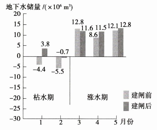 1. 建闸前,从枯水期到涨水期该湖区地下水储量变化主要是由于流域内 (
