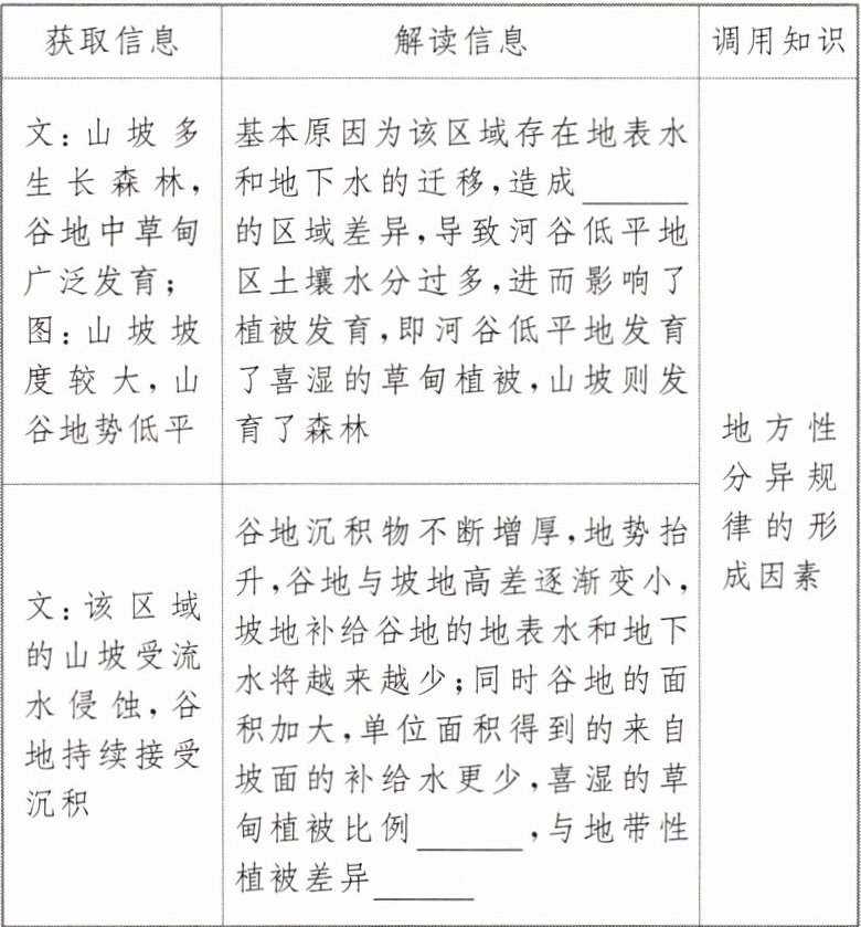 区域认知:图示区域属于小尺度地域的空间分异,需结合图示明确山坡与谷地植被的地方性分异。