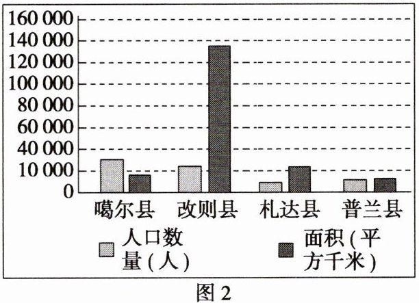 1.B 2.D 第1题,人口密度是单位土地面积上的人口数量,据图2可知,改则县虽人口数量较多,但面积远远大于其他3县,人口密度最低,B正确,A错误。第2题,西藏地区整体海拔较高,热量条件差。噶尔至改则一线以南地区,海拔较低,气温高,热量条件较好,人口密度较大,故影响阿里地区人口分布的首要因素是地形地势,D正确。