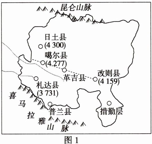 (2025·浙江金华十校模拟)据全国人口普查数据,西藏阿里地区总人口约12.3万人,且主要集中在西南一侧,若以噶尔至改则一线为界可以画出阿里地区的“胡焕庸线”,此线南部与北部的面积占比分别为36%和64%,人口占比分别为82%和18%。下图为阿里地区图(图中数字为海拔高度,单位:米)及部分县域面积和人口比较图。据此完成1~2题。
