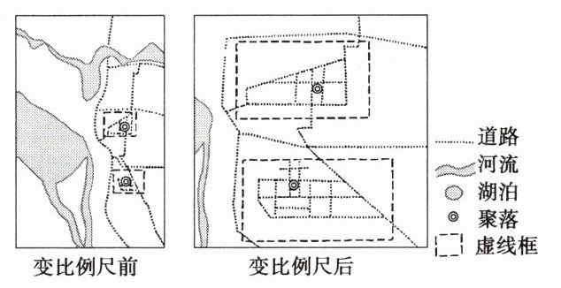 4.C 5.D 第4题,由图可知,虚线框内图上距离变大,但实际范围未变,故比例尺变大,内容显示更加详细。故选C。第5题,由图可知,相比于周围地区,虚线框内信息点数量较多,含多条道路、聚落,道路密度大,②④正确。故选D。