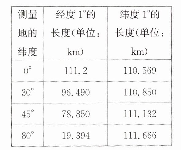科学家对地球不同经纬线的长度进行测量,统计结果如下表。据此完成下题。