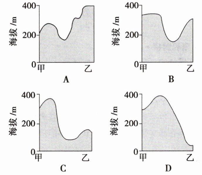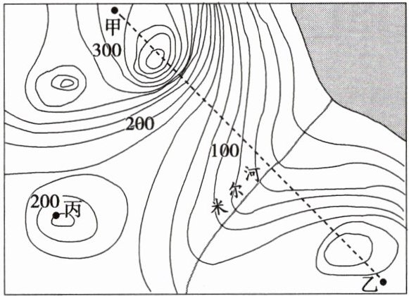 1.C 2.B 第1题,根据图中等高线判断,从甲到米尔河河道处,地势先升高后迅速下降,地势陡峭,且在靠近甲处附近海拔较乙处附近高,乙处海拔在120~140m之间,故C选项符合。第2题,图中等高距为20m,丙地位于200m等高线内的闭合曲线上,根据等高线知识点判断,其海拔应为220m,A错误;河流分布在山谷中,山谷等高线向海拔高处凸出,图中等高线向西南方向凸出,故该河流应是自西南流向东北,B正确;东南山峰等高线稀疏,地势较平缓,C错误;图中最高海拔大于380m,最低海拔在水域底部,在-20~0m之间,故最大高差大于380m,D错误。