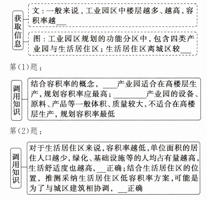 典例 2(2024·新课标卷)容积率是城市建设用地地块上总建筑面积与地块面积的比值。一般来说,工业园区中楼层越多,容积率越高。右图示意某城市工业园区规划的功能分区。其中,各产业园容积率按照适合生产的最大容许程度取值,以提高土地利用效率。生活居住区曾有以高层建筑为主的高容积率和以中高层建筑为主的低容积率两个规划方案,政府部门最后采纳了低容积率方案。据此完成(1)~(2)题。