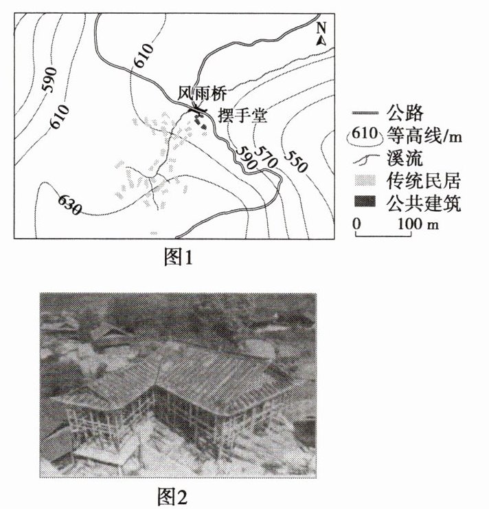 典例 (2024·新课标卷)湖南省永顺县双凤村是一个典型的土家族村寨,地处武陵山区腹地,村寨中一条小溪蜿蜒流淌,潺潺水声伴随着弯弯青石板路和依山而建的土家转角吊脚楼,勾勒出一幅土家山寨的美丽画卷,被誉为中国“土家第一村”。图1示意双凤村的建筑分布,图2示意在建的转角吊脚楼。据此完成(1)~(3)题。