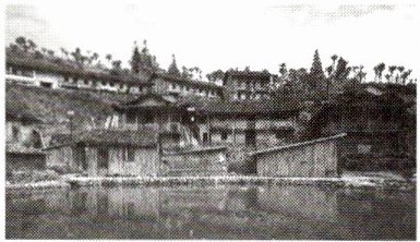 (2025·云南楚雄东兴中学月考)长坑村位于福建山区,当地民居多为土木结构,环池塘而建,土墙外壁贴挂整齐的杉木板。上图示意长坑村传统民居景观。据此完成1~2题。
