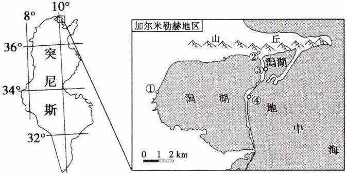 (2024·山东临沂二模)加尔米勒赫地区(下图)的居民利用潟湖沙坝种植作物。当山丘上的雨水到达高潮时,雨水并未立即与下层咸水混合,而是在表面形成薄层淡水,并随潮汐被输送至耕作区的作物根部,在无人工供水的情况下实现全年种植。此外,当地居民还根据潟湖的水位变化,采用增减少土的方式调整作物种植高度,避免作物根系受下层咸水影响。据此完成 1~2 题。