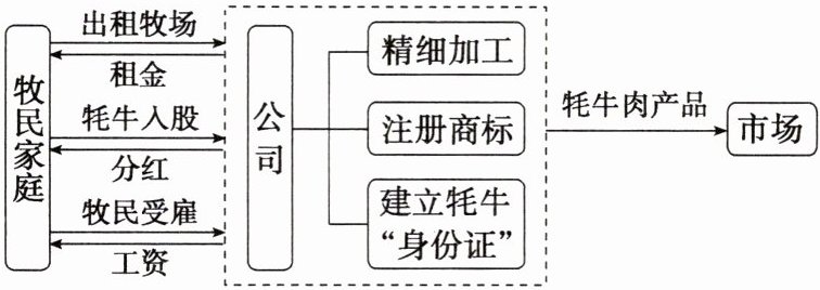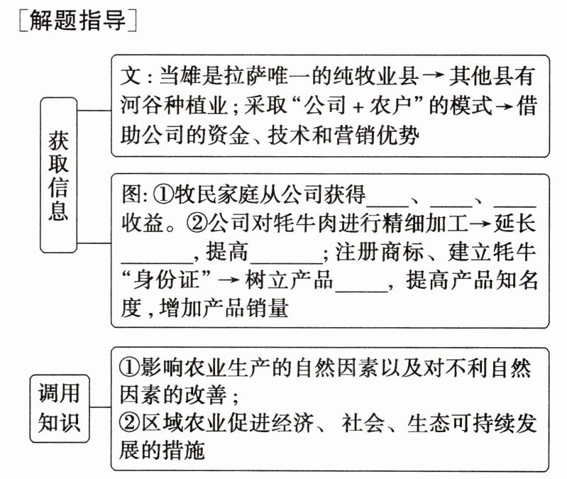 典例 2(2022·全国乙卷)当雄是拉萨唯一的纯牧业县,牧民占比约 90%,依托特色畜种牦牛。甲公司成立于 2017 年初,采取“公司+农户”的模式(下图),生产的有“身份证”的牦牛肉产品销往全国各地,广受消费者欢迎。据此完成(1)~(3)题。
