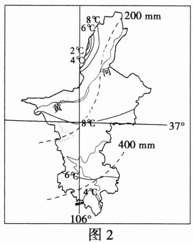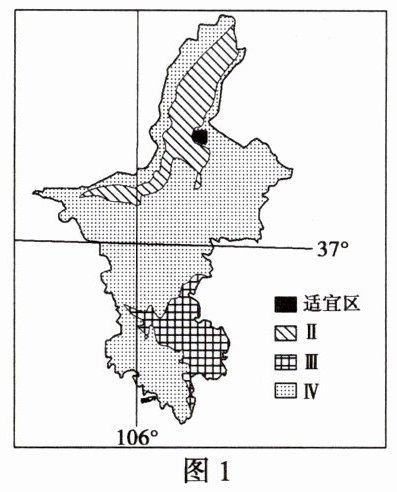 材料一 桃树适宜在年平均气温 8~14℃的冷凉地区生长,较为耐旱,但在年降水量小于 400mm 的地区需要灌溉。结合桃树的生长习性,将宁夏划分为桃树适宜区、次适宜区、不适宜区及不可种植区(图 1)。图 2 为宁夏年平均气温、年降水量分布图。