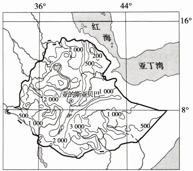 埃塞俄比亚人口超过 1 亿,农业人口约占 80%,以小农户为主,农业是经济支柱。该国土地资源丰富,干湿季分明,绝大多数耕地只在湿季种植作物,灌溉农田比例小;工业基础及道路、供电等设施薄弱。近年来,该国引进灌溉农机具,但推广缓慢。下图示意埃塞俄比亚地形。