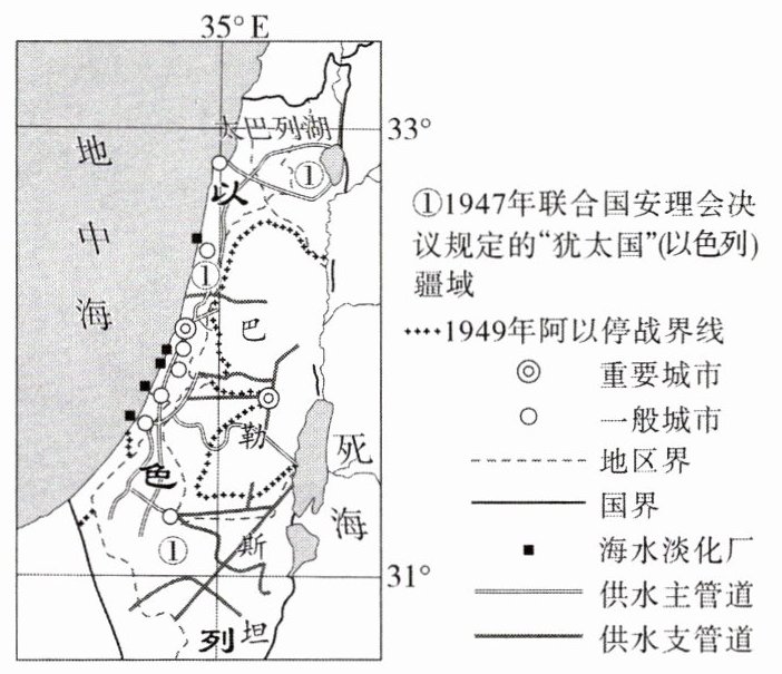 为缓解淡水资源短缺问题,以色列政府从2001年开始推行海水淡化计划,鼓励企业实行“电水联产”模式,即企业在建设海水淡化厂时,兴建以地中海丰富的天然气为能源的发电厂,且并入国家电网(由进口煤炭发电支撑,成本较高)。目前地中海沿岸地区已建成5家这样的海水淡化厂,每年生产的淡水相当于全国淡水用量的1/3,且被统一纳入国家供水网络优先利用。以色列政府于2022年启动淡化水反注太巴列湖工程,打造淡水“蓄水库”,以缓解最大水源地太巴列湖水位迅速下降的状况。下图示意以色列地中海沿岸地区海水淡化厂及供水网络的分布。