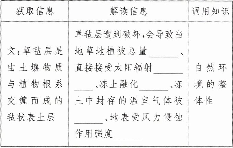 人地协调观:从要素综合的角度,分析草毡层遭到破坏后的环境影响。