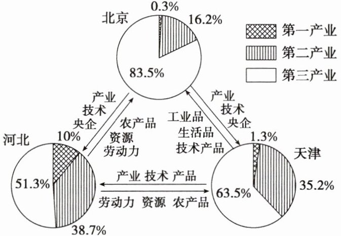 (2025·江西上饶骏华学校测评)京津冀协同发展的核心是有序疏解北京非首都功能。下图是2019年京津冀产业结构与产业转移示意图。据此完成3~4题。
