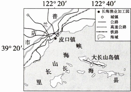 (2025·广东深圳开学考试)长海县位于辽东半岛东侧黄海北部海域,全县由195个海岛组成,是东北地区唯一海岛边境县,该县借址普兰店市皮口镇荒芜海岸建设渔业加工园,发展渔产品加工业,下图为两地区域简图。据此完成1~2题。