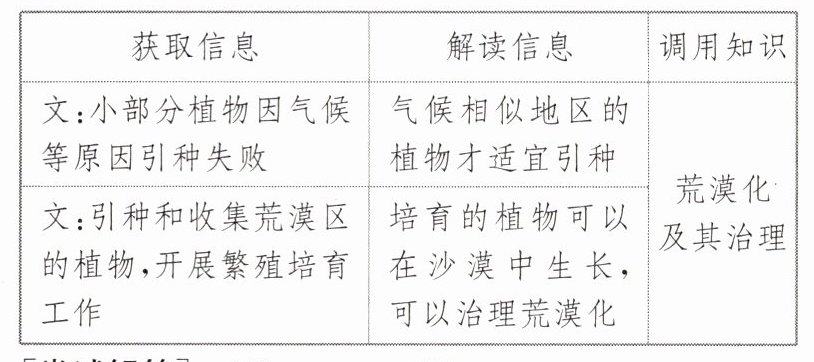 典例 (2022·海南卷,节选)在治理吐鲁番风沙的过程中,中国科学院的科研人员克服各种困难,建设了吐鲁番沙漠植物园,引种和收集荒漠区的植物,开展繁殖培育工作。除了小部分植物因气候等原因引种失败外,目前已成功引种栽培500多种植物。据此完成(1)~(2)题。
