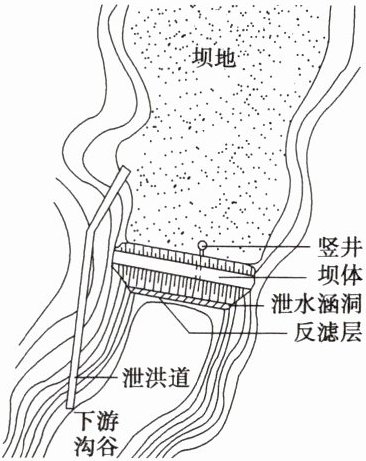 淤地坝的产生源自人们在生产与生活中对水资源高效利用的自觉追求以及对水土保持、防灾减灾的现实渴望。淤地坝具有充分利用水土资源、拦泥淤地、建设农田、发展农业生产、减少入河泥沙等功能。一般淤地坝不设反滤层,但一些泉水多、有常流水的沟道,在坝的下游坡脚修反滤层,反滤层由细沙、石子、块石干砌(砌体之间的缝隙没有砂浆,直接铺码在一起)而成。上图示意我国某地淤地坝布置形式。据此完成 1~2 题。