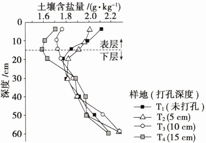 (2023·广西卷)在华北平原某盐碱地,有研究小组于返盐、积盐现象最严重的季节开展“打孔灌沙”实验:选四块相隔不远、性状一致的平整样地,对其中三块地按相同的密度和孔径、不同的深度打孔并填满砂粒;在向四块样地定量漫灌后,观测土壤含盐量的变化情况。