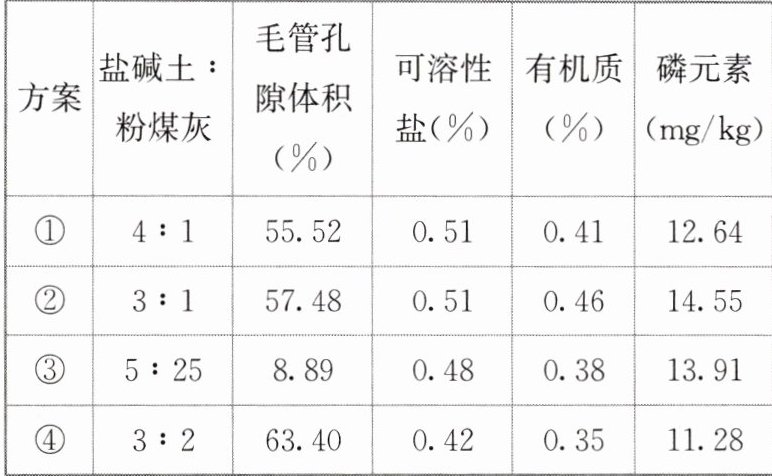 4. 粉煤灰对盐碱地的改良实验中,效果最佳的方案是 (