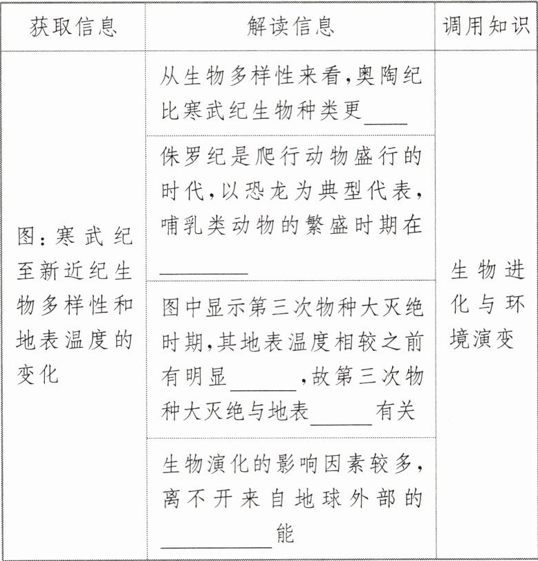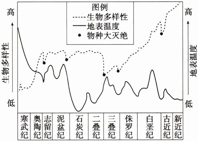 典例1 (2022·北京卷,节选)下图示意寒武纪至新近纪生物多样性和地表温度的变化。读图,回答下题。