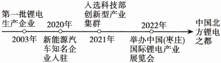 (2024·广东佛山期末)山东省枣庄市曾是我国重要的煤炭能源基地,随着煤炭资源的日益枯竭,该市经济增长出现困境。2003 年,枣庄市开始布局锂电产业,主要生产电解液、电芯等低端产品。2021 年以来,枣庄逐渐形成完整的锂电全产业链,蓄力打造我国北方锂电之都。下图示意枣庄市锂电产业发展历程。据此完成 1~2 题。