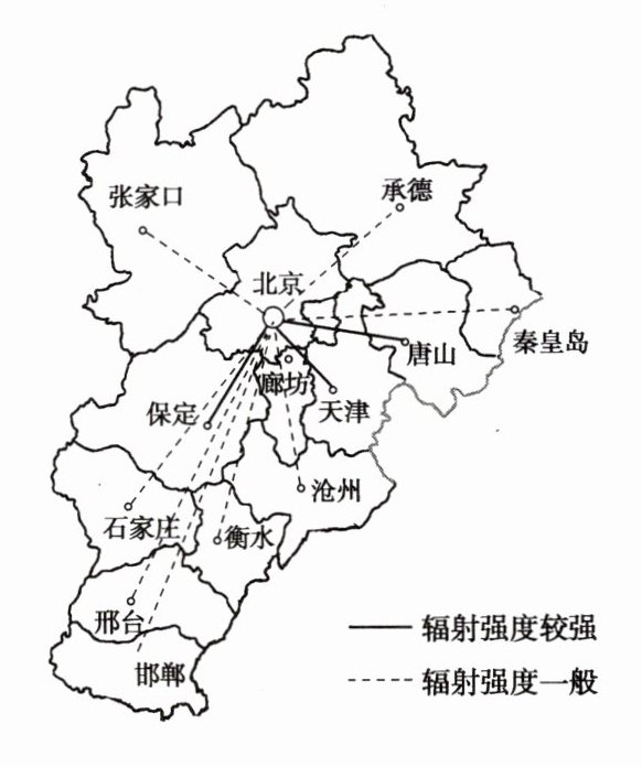 京津冀城市群是我国北方第一大城市群体,以北京与天津为中心。下图为北京对京津冀城市群内其他城市的经济辐射范围及强度示意图。据此完成2~3题。