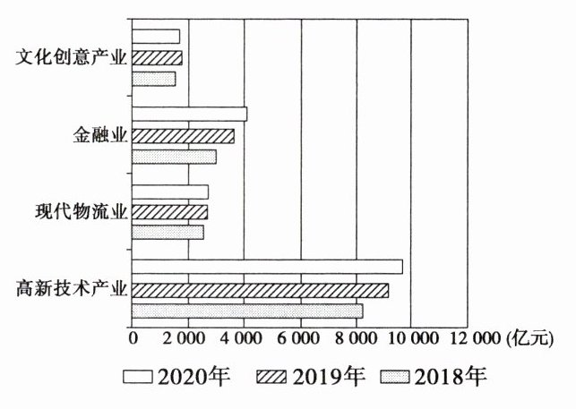 深圳市是全国产业发展的高地之一,产业结构不断优化升级,形成了以四大支柱产业为基础的产业结构,下图为深圳市 2018~2020 年四大支柱产业增加值统计图。据此完成 1~2 题。