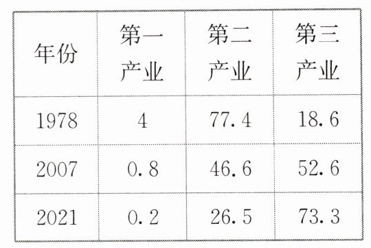 上海市入围世界 Alpha+城市,基本建成国际经济、金融、贸易、航运中心,形成具有全球影响力的科技创新中心基本框架。下表为 1978 年、2007 年与 2021 年上海市三大产业占 GDP 的比重变化情况(%)。据此完成 3~4 题。
