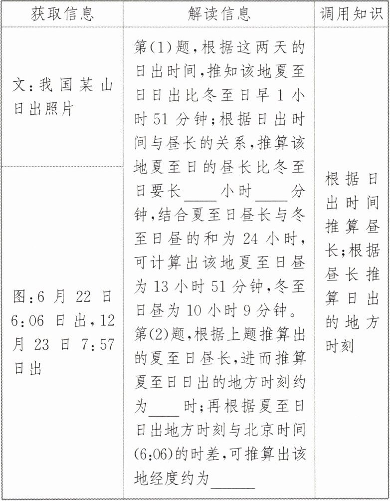 区域认知:根据夏至日(冬至日)日出地方时与北京时间的地方时差,推算其经度位置;或者根据夏至日(冬至日)的昼夜长短,推测其纬度位置。