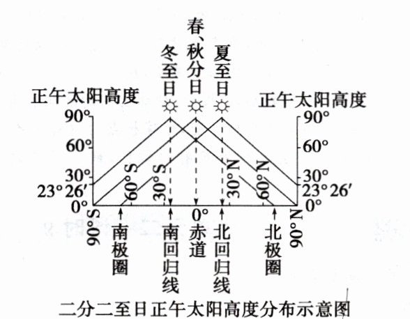1.绘图:请在下图中用折线画出二分二至日正午太阳高度的分布状况。