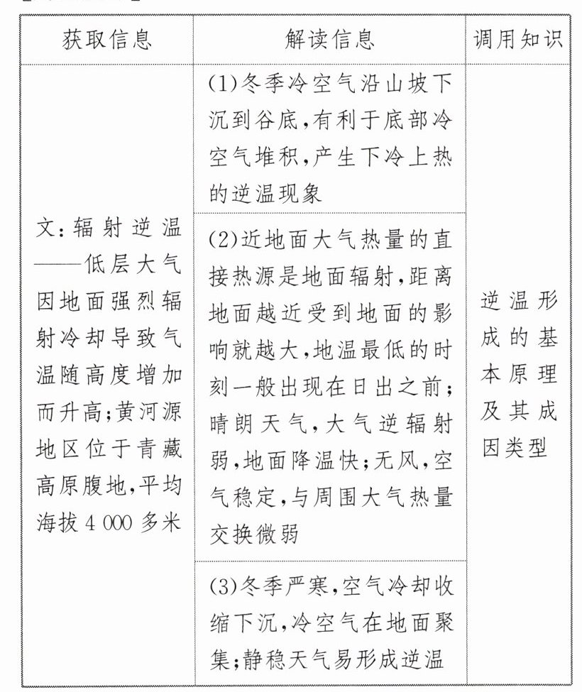 典例 (2021·广东卷)辐射逆温是低层大气因地面强烈辐射冷却导致气温随高度增加而升高的现象。黄河源地区位于青藏高原腹地,平均海拔4000多米,冬季辐射逆温现象多发。据此完成(1)~(3)题。