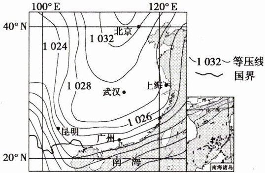 等压线是指气压相等的点的连线,实际上是等压面和等高面的交线,所以等压线分布图表示在同一高度上气压水平分布的状况。下图为某日上午8时东亚局部地区海平面等压线分布(单位:hPa)。据此完成5~6题。