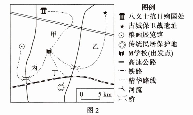 典例2 (2021·北京卷)我国某镇利用当地主产的粮食制作粮画,打造粮画小镇。图1是M学校设计的小镇地理位置指示牌,图2是该校设计的四条“行走的思政课”精华路线示意图。读图,回答(1)~(2)题。