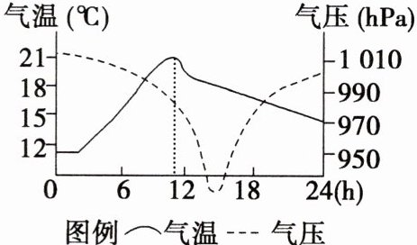 下图示意某气象站测得的本站某日气温和气压的变化情况。据此完成2~3题。