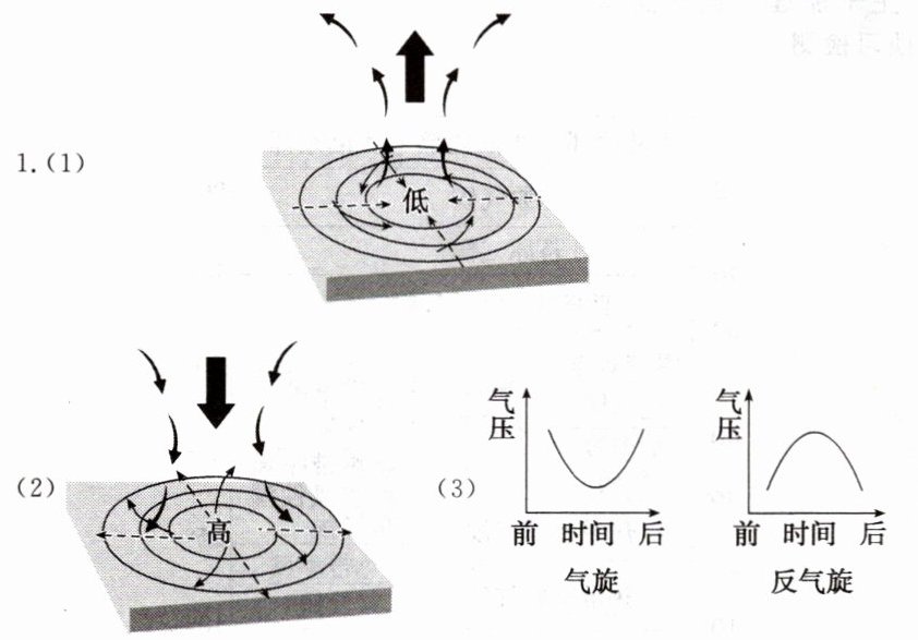1.绘图:(1)画出北半球气旋的水平气流(图中虚线为水平气压梯度力)与垂直气流的运动方向。