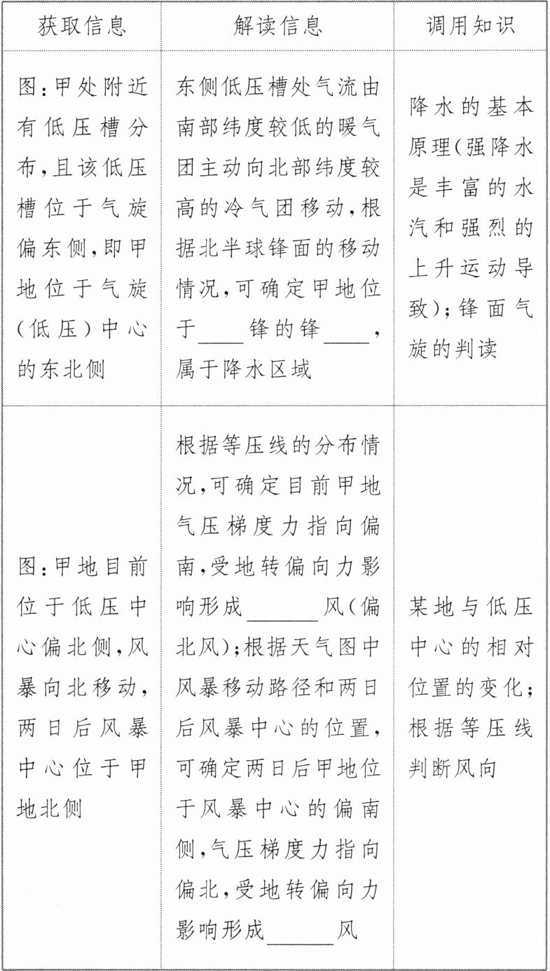 综合思维:结合图示信息,从等压线的分布、风向、气团的性质及天气状况等多种因素角度分析风暴过境的天气特征变化。