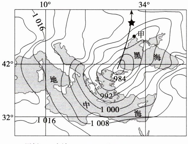 典例 (2024·浙江1月选考)2023年某日,一场源自地中海的风暴席卷黑海北岸,给甲地带来强降水。下图为该日某时刻的天气形势图。据此完成(1)~(2)题。