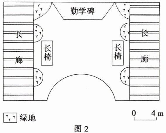 (2025·黑龙江牡丹江开学考试)某学校组织绘制校园平面图的地理实践活动,同学们积极进行测量、计算、绘制完成作品。图1为校园平面图,图2为“文修园”平面图。据此完成1~2题。