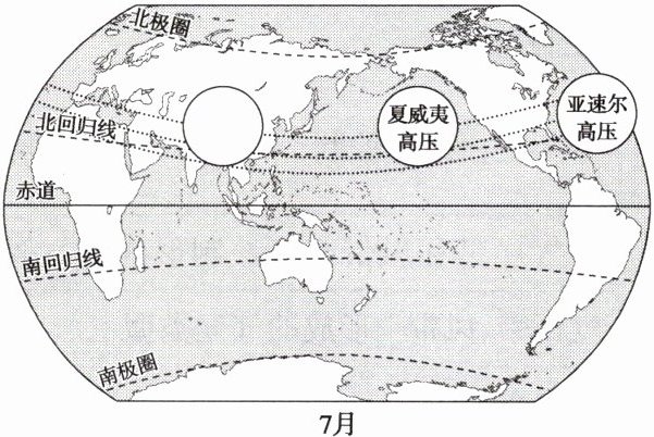 (2)在下图中填出虚线处的气压带及亚欧大陆气压中心的名称,并画出7月东亚、南亚季风风向。